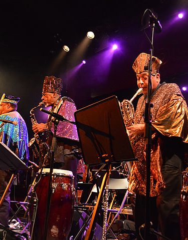 The Arkestra performs today led by alto saxophonist and long-time Ra collaborator Marshall Allen. The mischievous brass blasts and the grooves keep rolling, as the big band – fully dressed, as usual, in space capes with a hint of Ancient Egypt – takes off once again in a joyous burst of tightly organised madness.