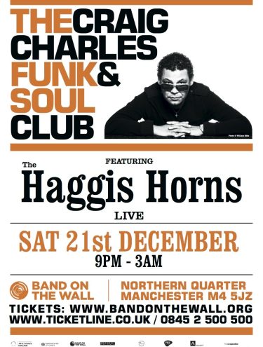 The Craig Charles Funk and Soul Club returns with the internationally-acclaimed Haggis Horns live plus presenter, DJ, actor and funkster Craig Charles manning the decks ’till the early hours with the planet’s funkiest tunes.