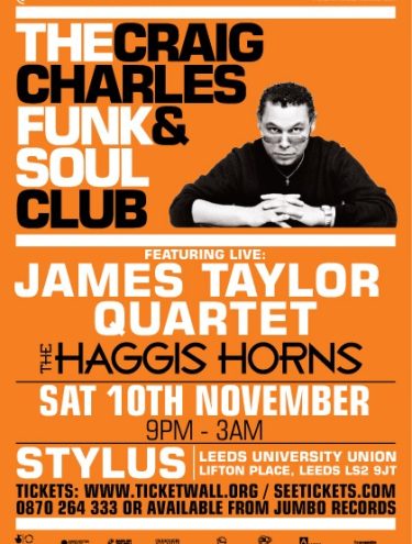 A massive night as The Craig Charles Funk & Soul Club comes to Leeds featuring the internationally-acclaimed titans of funk The James Taylor Quartet and the mighty Haggis Horns live. Plus BBC R6 DJ and actor Craig Charles and Mr Paul Dunphy manning the decks ’till 3am with the planet’s funkiest tunes.