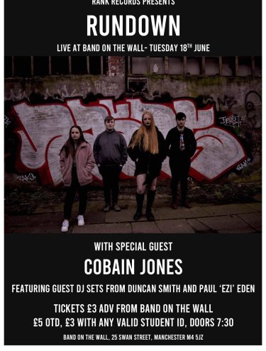 Unsigned indie band Rundown headline, with support from solo artist Cobain Jones and two indie DJs – Paul “Ezi” Eden and Duncan Smith.